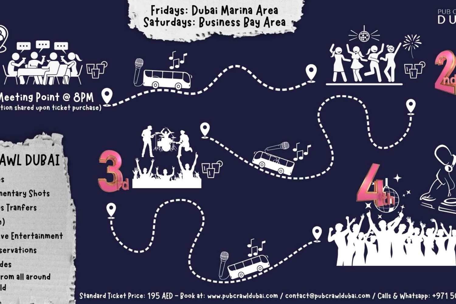 Gör dig redo för en oförglömlig natt i Dubai med oss! Våra erfarna festguider, en dedikerad festbuss och en noggrant planerad tur till fyra olika lokaler varje lördag är receptet för en rolig kväll! Du kan umgås, dricka och dansa i total komfort med människor från hela världen. Det är det perfekta sättet att träffa nya vänner, njuta av Dubais nattliv och utforska de bästa barerna och evenemangen, utan att behöva anstränga dig!