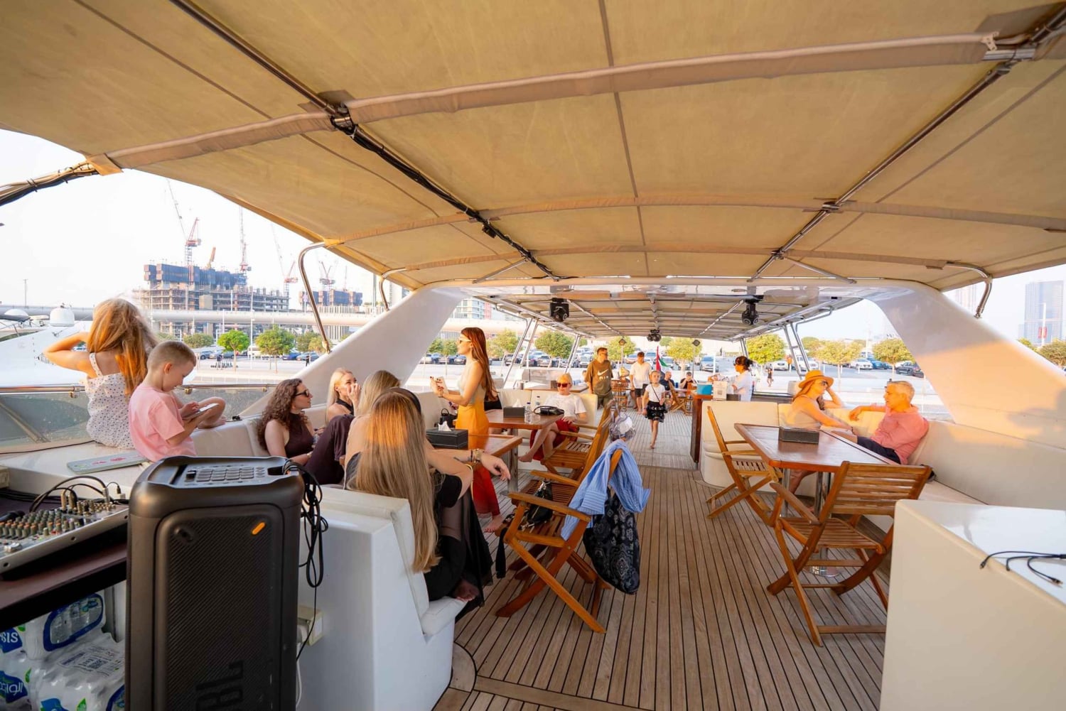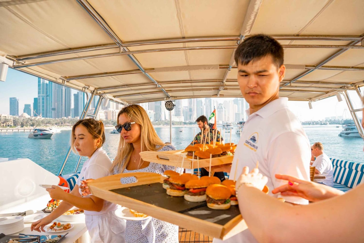 Följ med på en delad solnedgångs- eller nattkryssning i Dubai. Njut av den fantastiska utsikten medan du avnjuter sliders, vårrullar, smörgåsar, frukt, läsk, öl, vin och mousserande vin.