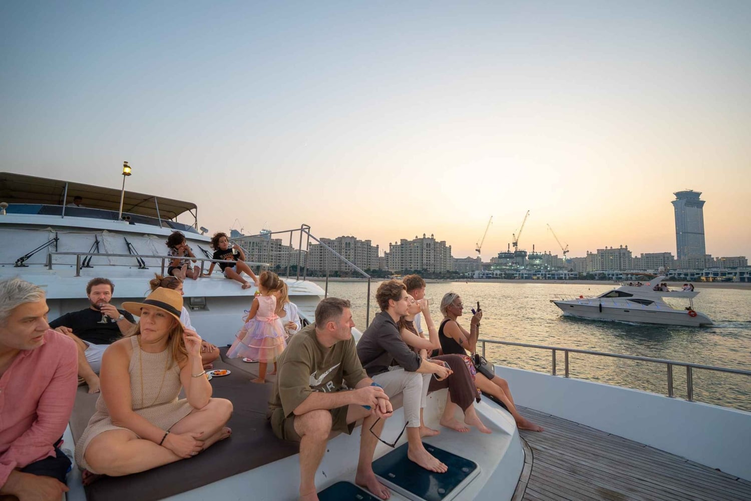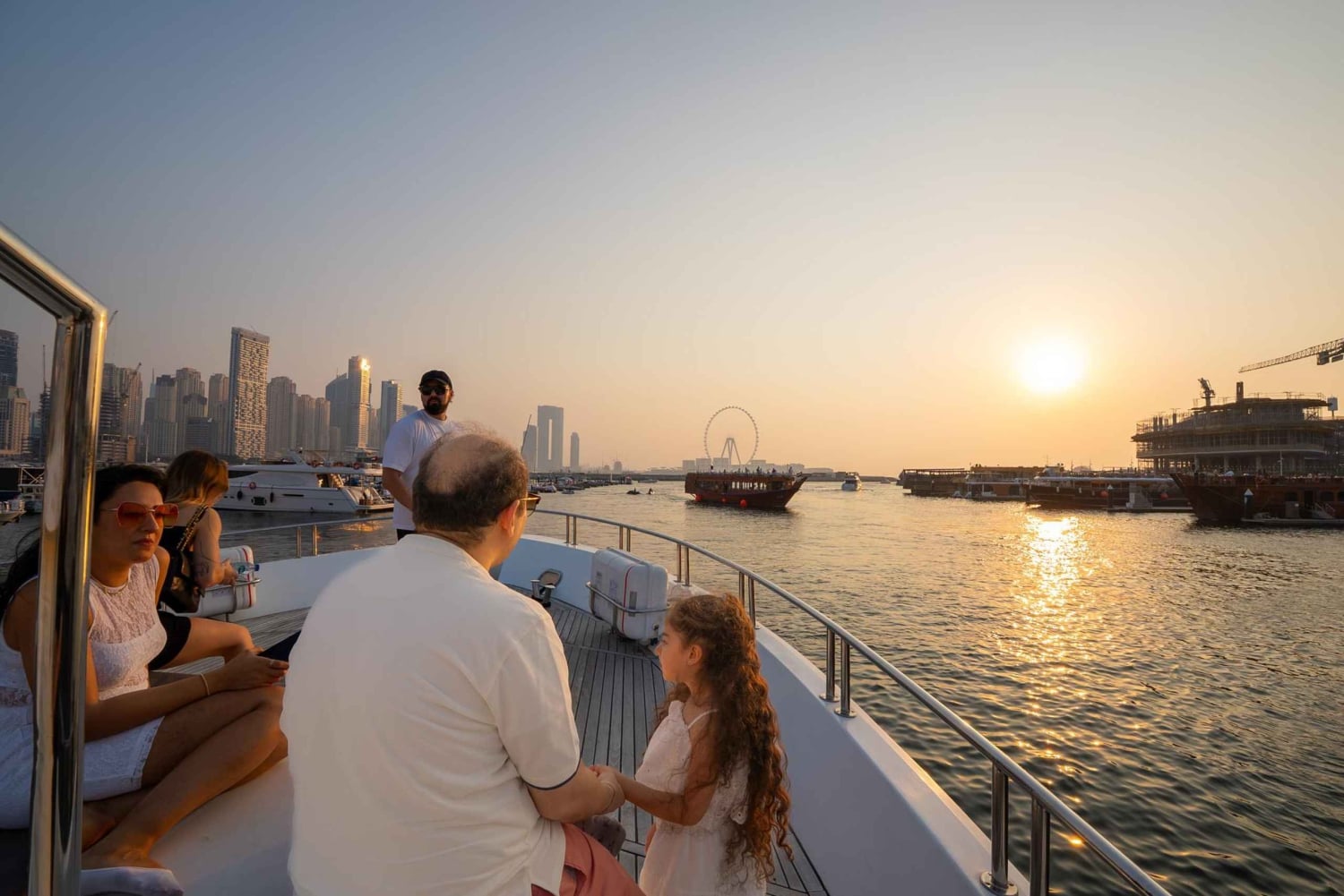 Ge dig ut på en förtrollande solnedgångskryssning (delad resa) som går från 17:00 till 19:00 varje dag i Dubai, och njut av en lugn 2-timmars resa. Låt den fascinerande utsikten över Dubai Marina, JBR och Burj Al Arab fängsla dina sinnen. Njut av klubbsmörgåsar, kyckling- och nötköttssmörgåsar, grönsaksvårrullar, kycklingsamosas och en färsk frukttallrik Njut av uppfriskande drycker som öl, rött vin, vitt vin, mousserande vin, vatten och läsk. Vegetarisk mat finns tillgänglig på begäran.